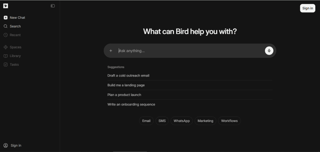 Bird is an omnichannel communication and marketing platform designed to help businesses connect with customers across multiple channels from a single system. These channels include SMS, email, WhatsApp, voice, and other messaging platforms, all managed through a unified interface.