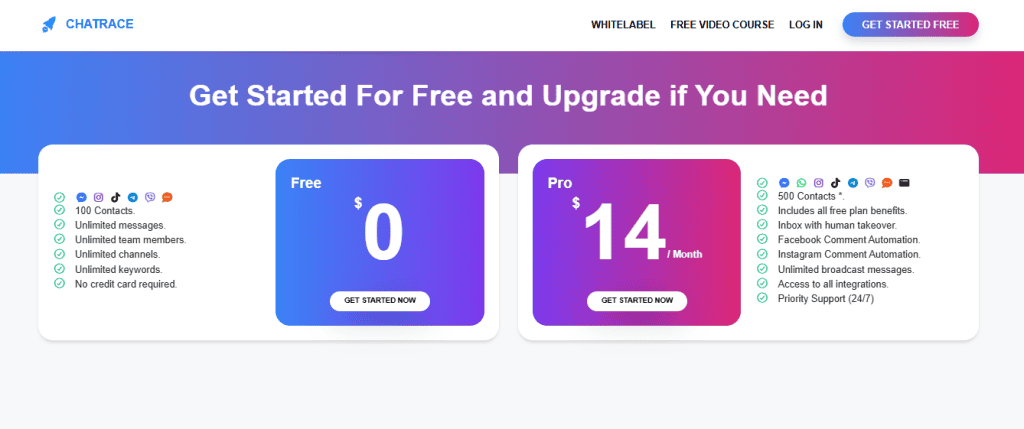 Chatrace pricing is generally affordable and designed for small businesses. Plans vary depending on features and usage, with the pro plan starting from $14/month.