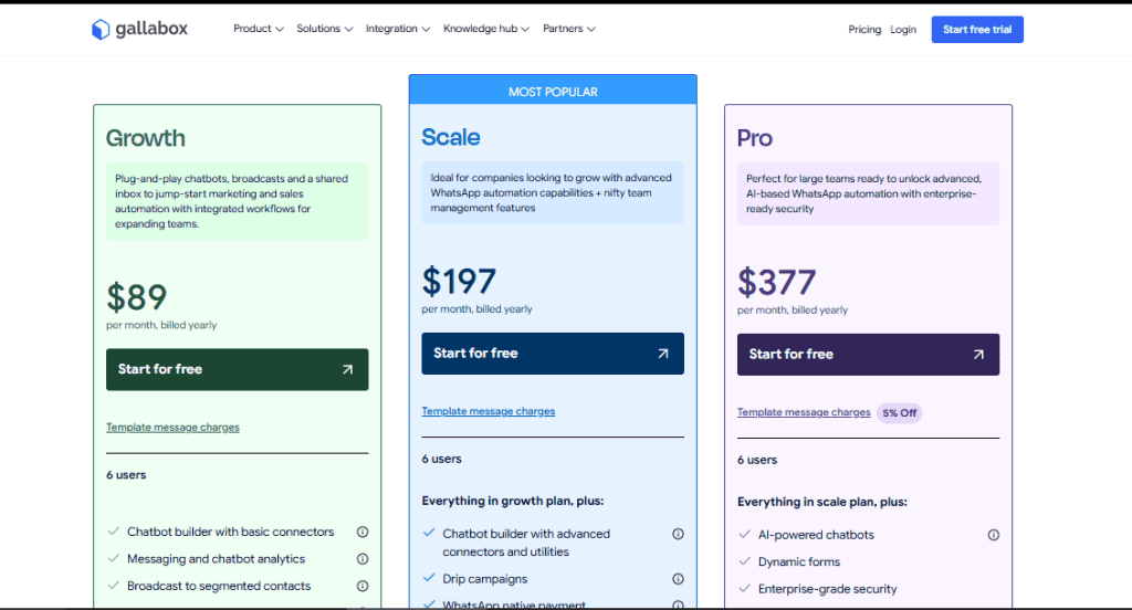 Gallabox pricing starts at $89/month (Growth plan) and goes up to $377/month (Pro plan). Higher tiers unlock advanced automation, integrations, and security features.