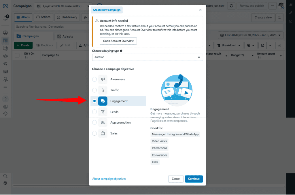 Select the Engagement objective. This is important. Engagement campaigns are optimized to start conversations, not just generate clicks or impressions.