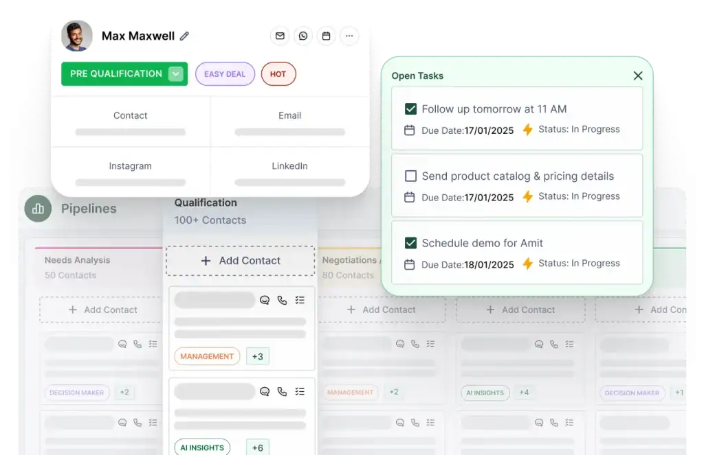 - WhatsApp Sales CRM: Interakt includes a simple CRM that helps businesses manage leads and customer conversations in one place. Teams can track interactions, organize contacts, and follow up with prospects directly through WhatsApp.