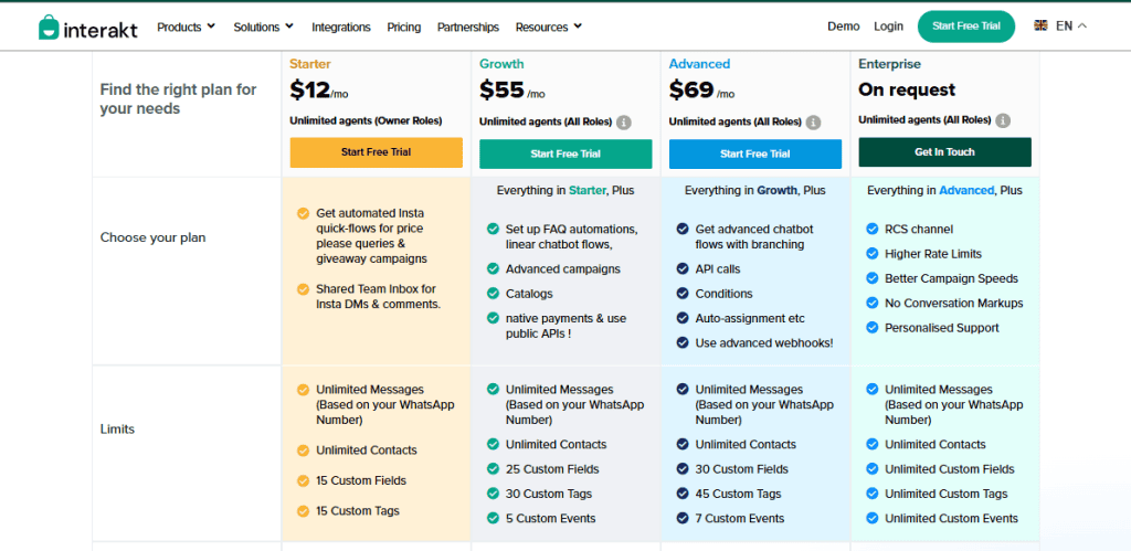 Interakt pricing starts at $12 per month for the Starter plan. The Growth plan is around $55 per month, while the Advanced plan is about $69 per month. There is also an Enterprise plan with custom pricing for larger businesses.