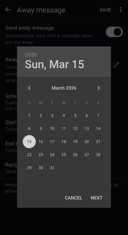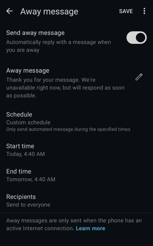 If you’re using the WhatsApp Business app, you can’t fully schedule outgoing messages. However, the app does provide a useful automation feature called Away Messages.