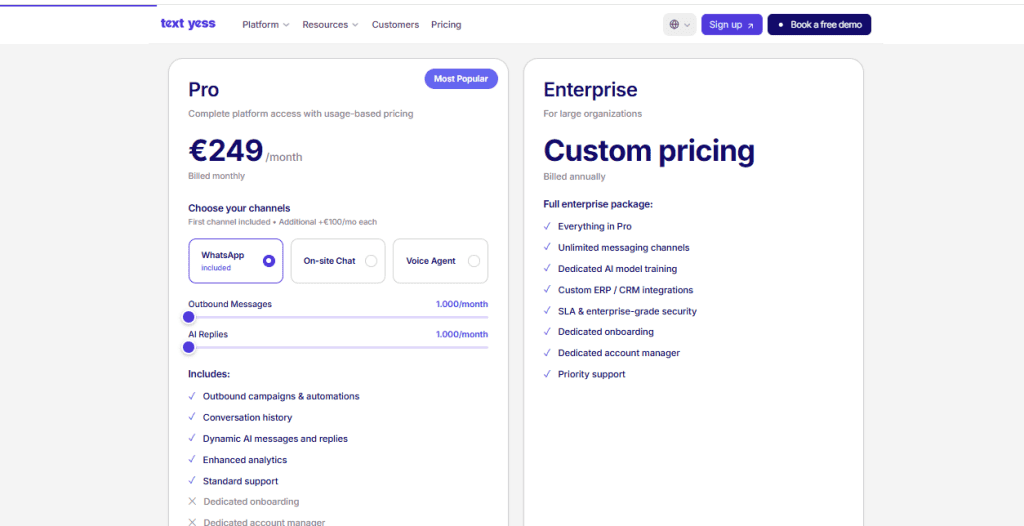 TextYess pricing starts at around €249 per month for the Pro plan, which includes usage limits for messages and AI replies. There is also a custom enterprise plan with additional features, integrations, and support.