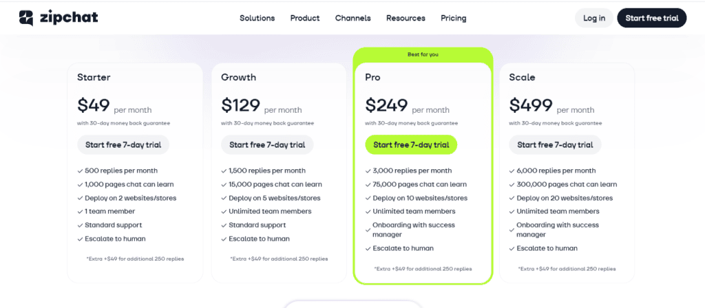 Zipchat uses a usage-based pricing model tied to AI replies. Its Starter plan begins at $49/month for 500 replies, then scales to $129/month for 1,500 replies. While this works well for businesses with lower traffic, costs can increase quickly as more customers interact with the chatbot. The more conversations you have, the more you pay.